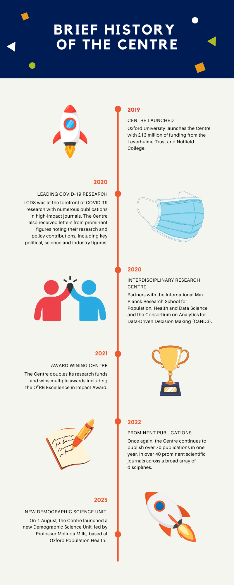 - Leverhulme Trust awards a Large Centre Grant with support from Nuffield College to launch the LCDS with £13 million of funding for an period of 10 years at the University of Oxford
