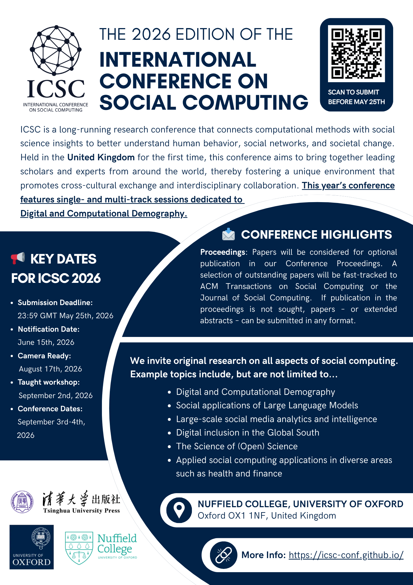 Researchers associated with the Leverhulme Centre for Demographic Science (LCDS) are among the Oxford-based organisers of the 7th International Conference on Social Computing 2026 (ICSC 2026), which will be held in person at Nuffield College, University of Oxford, from 2–4 September 2026. The conference is designed to bring together scholars working at the intersection of big-data analytics, computational methods, and social science theory.