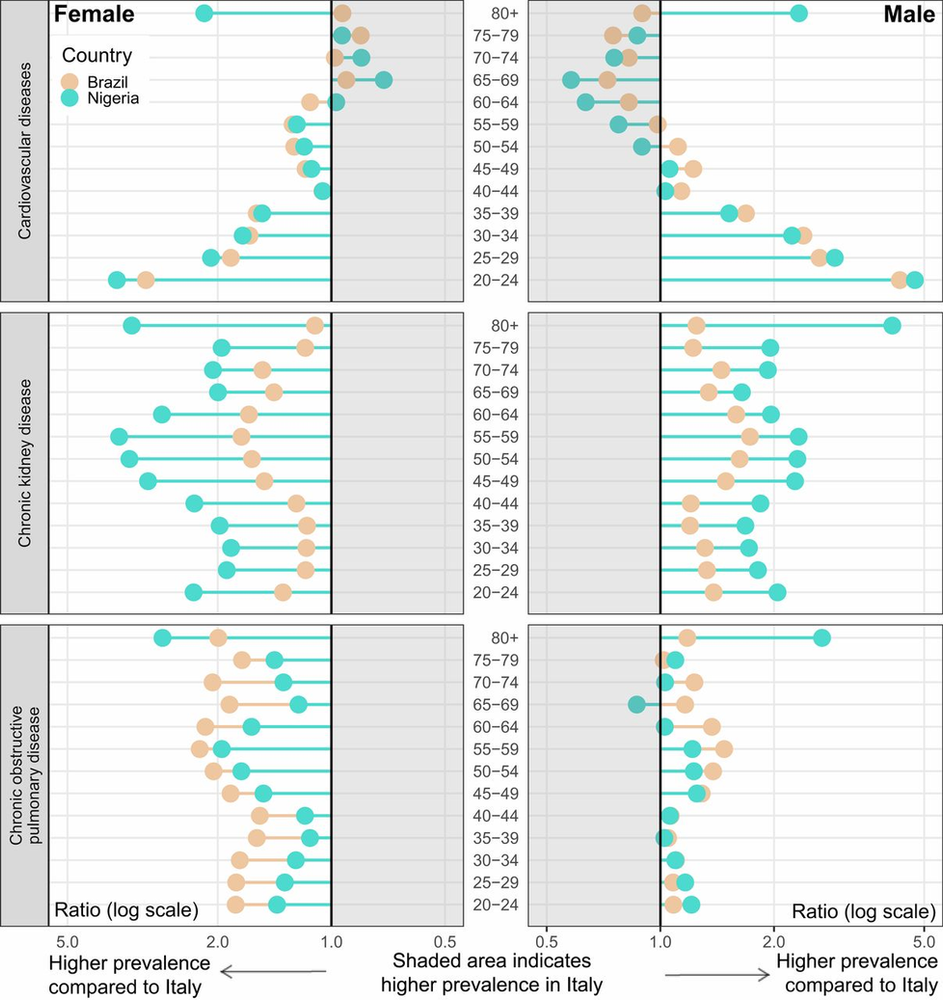 Figure 1 from Nepomuceno et al. (2020) - Relative prevalence by health condition and age in Brazil and Nigeria compared to Italy: female and male, 2017.